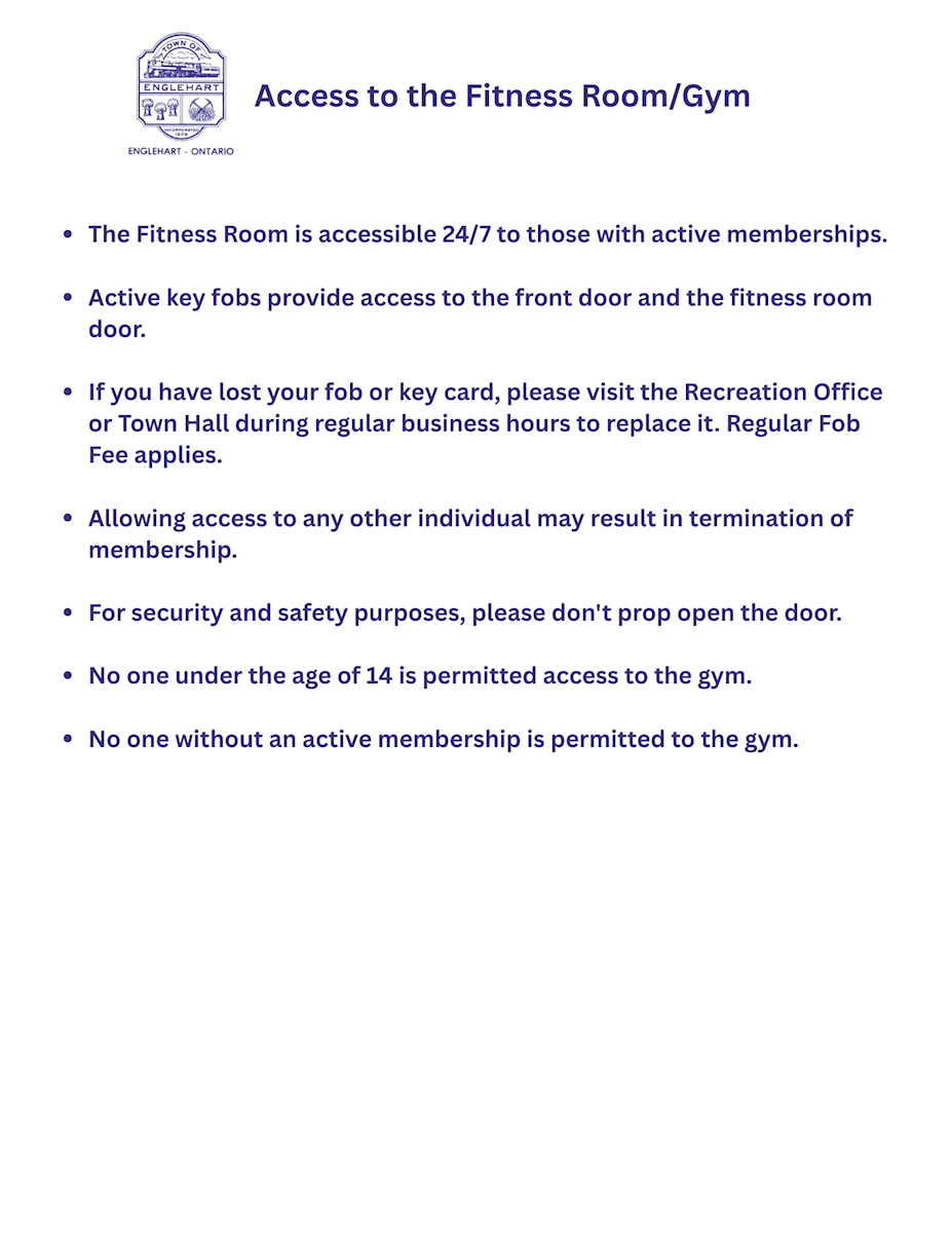 The Town of Englehart has established a variety of policies and procedures to ensure the members of the Englehart & Area Community Arena Complex Fitness Room have both a positive and safe experience while using the facility. We require that our members review and adhere to the following policies. The Town of Englehart reserves the right to change policies as required and to revoke membership or suspend any member who does not comply with these policies and procedures.